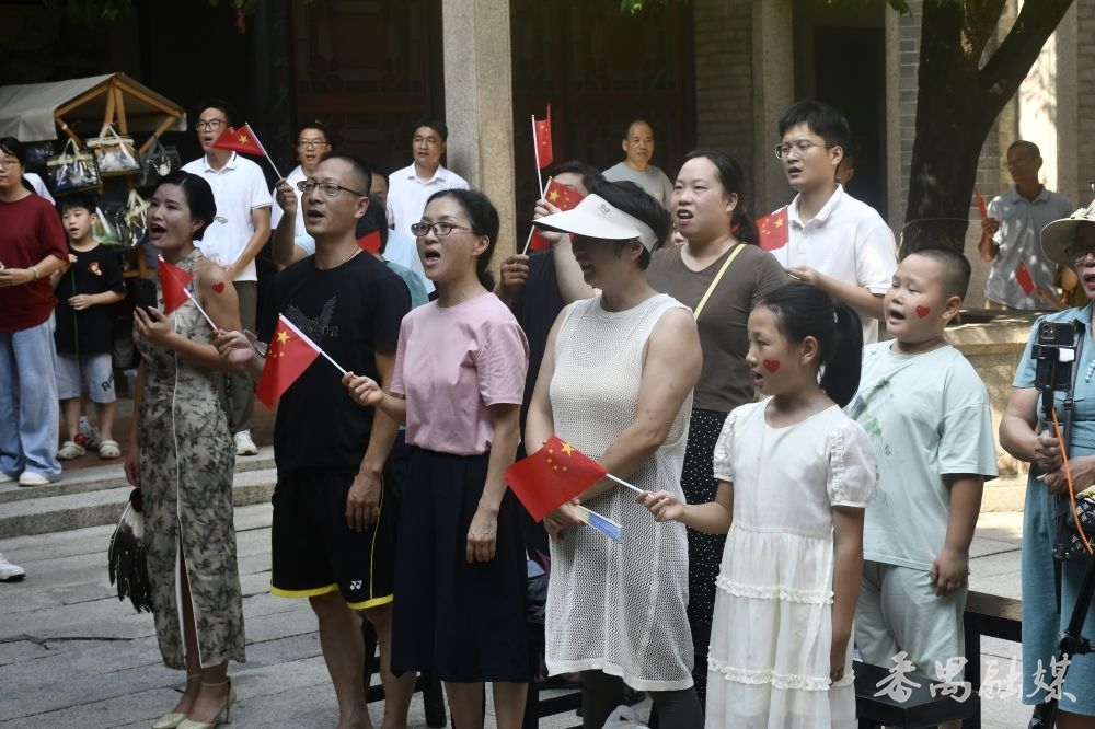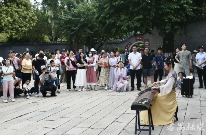 《盛世国乐》《就是哪吒》等曲目悠然悦耳的古筝声回荡在园林中;身着国风服饰的舞者翩翩起舞,裙角翩跹,让路过的游人不自觉放慢脚步观赏,看到精彩处忍不住鼓掌喝彩。书画展与便签墙,满藏着情怀与祝福文昌苑内的“人月两圆·家国同欢”乔平师生书画展。这些书画作品,每一笔都写着对家国的爱。国庆当天,广场上游客们深情演唱一首首爱国歌曲,表达对祖国的爱。主题打卡点的便签墙被游客们贴得满满当当,“愿祖国繁荣昌盛”“国泰民安”的字迹,和园林里的古建筑一样,成了最珍贵的“时光印记”。