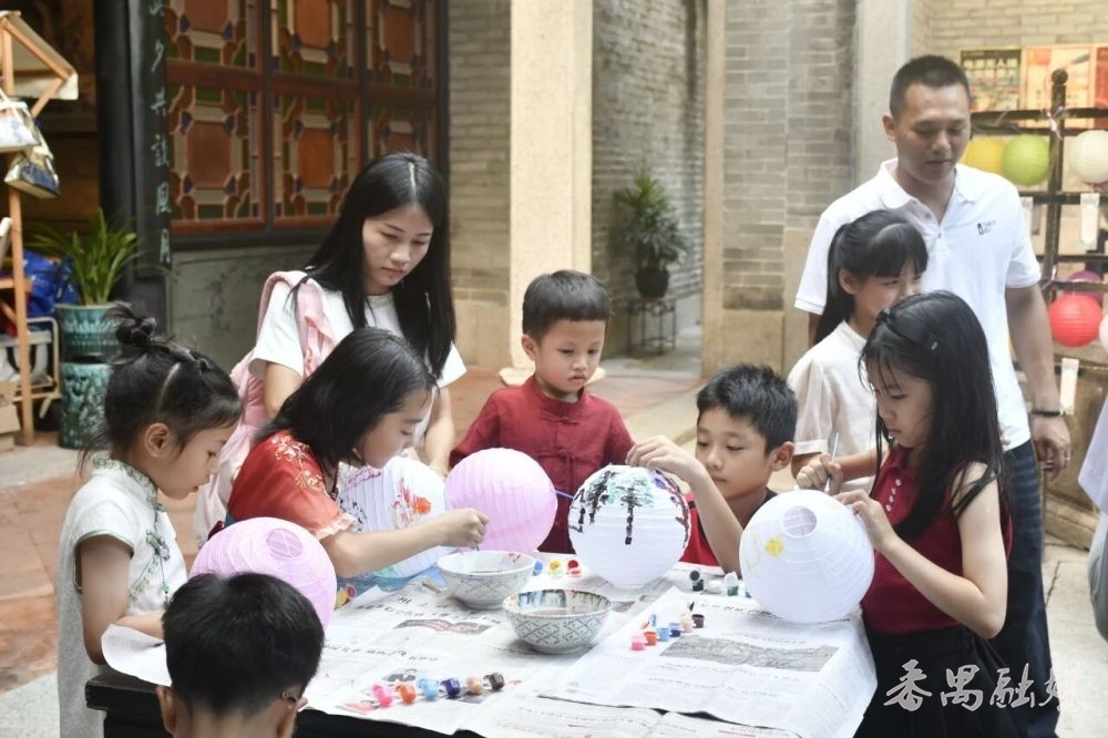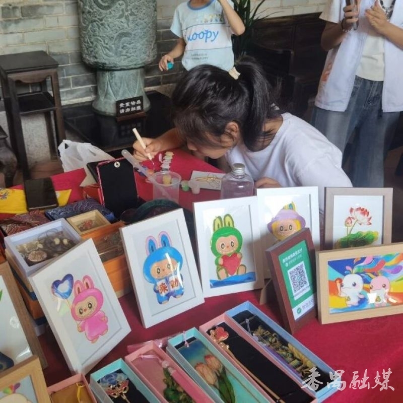 中秋当天的猜灯谜区更是热闹非凡,猜中3个灯谜就能领空白灯笼涂鸦,孩子们笔下的桂花、圆月与家国情怀,映着廊下的宫灯,如此恰合时宜。亲子家庭则忙着打卡兰文化主题的探秘游戏,他们拿着任务卡在回廊间穿梭,找寻一个个问题的答案。欢度国庆更有非遗传承人把“工作室”搬到现场,展示掐丝珐琅、绒花、香云纱等非遗技艺。游客不仅能看传承人露一手绝活儿,听她讲讲制作里的门道,还能DIY,把这份独一无二的手作浪漫带回家。