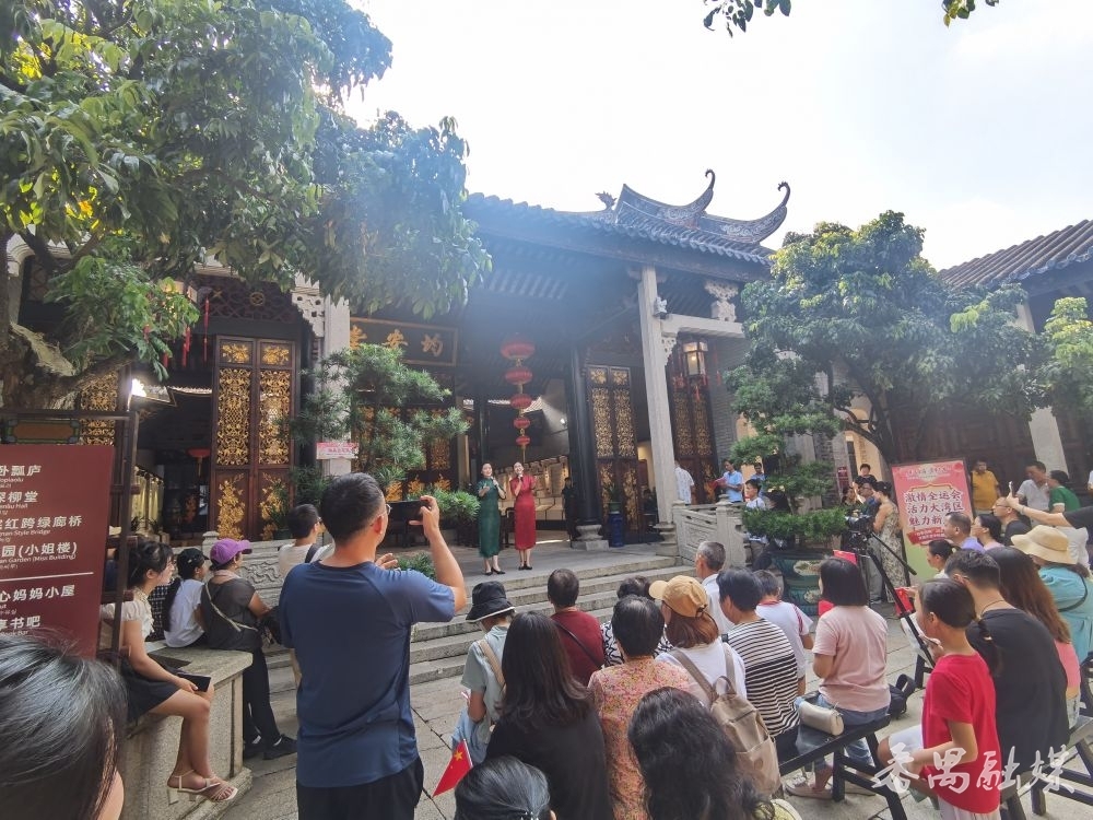 古典园林里的国风快闪,吸引了众人的目光和参与。国庆当天的朗诵音乐会把氛围感拉满,朗诵、演唱、舞蹈、快板、诗意旗袍等多种艺术形式交织,家国情怀在园林中回荡。武术快闪中,拳法刚劲、太极悠然,刀枪剑棍的冷硬与檐角惟妙惟肖的灰塑狮相映成趣,刚柔并济的风采让游客纷纷驻足抓拍。