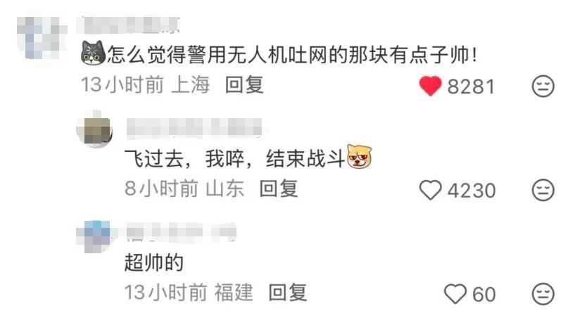 网友发布的视频中,她表示在观看再就业男团演唱会前夕,于杭州奥体中心外围看到一架警用无人机抓捕了一架“黑飞”无人机,警用无人机用抓捕网将另一架带回到地面上。